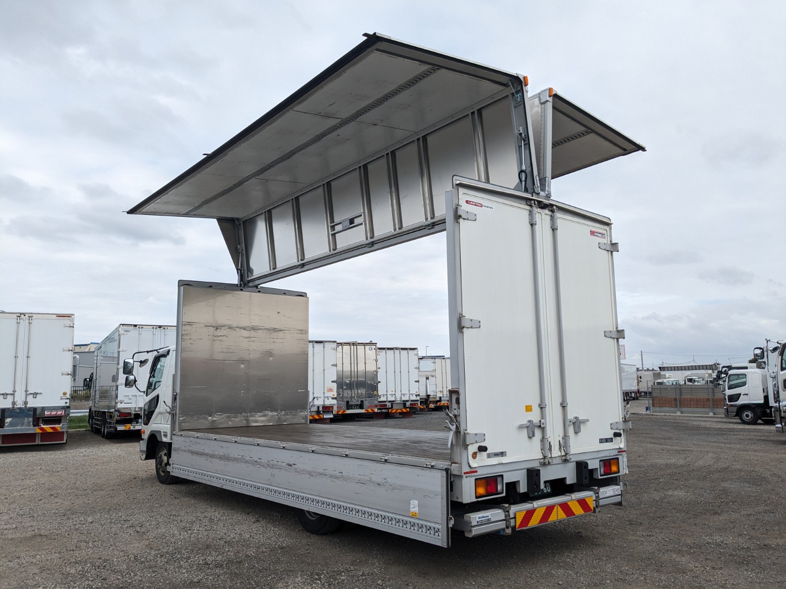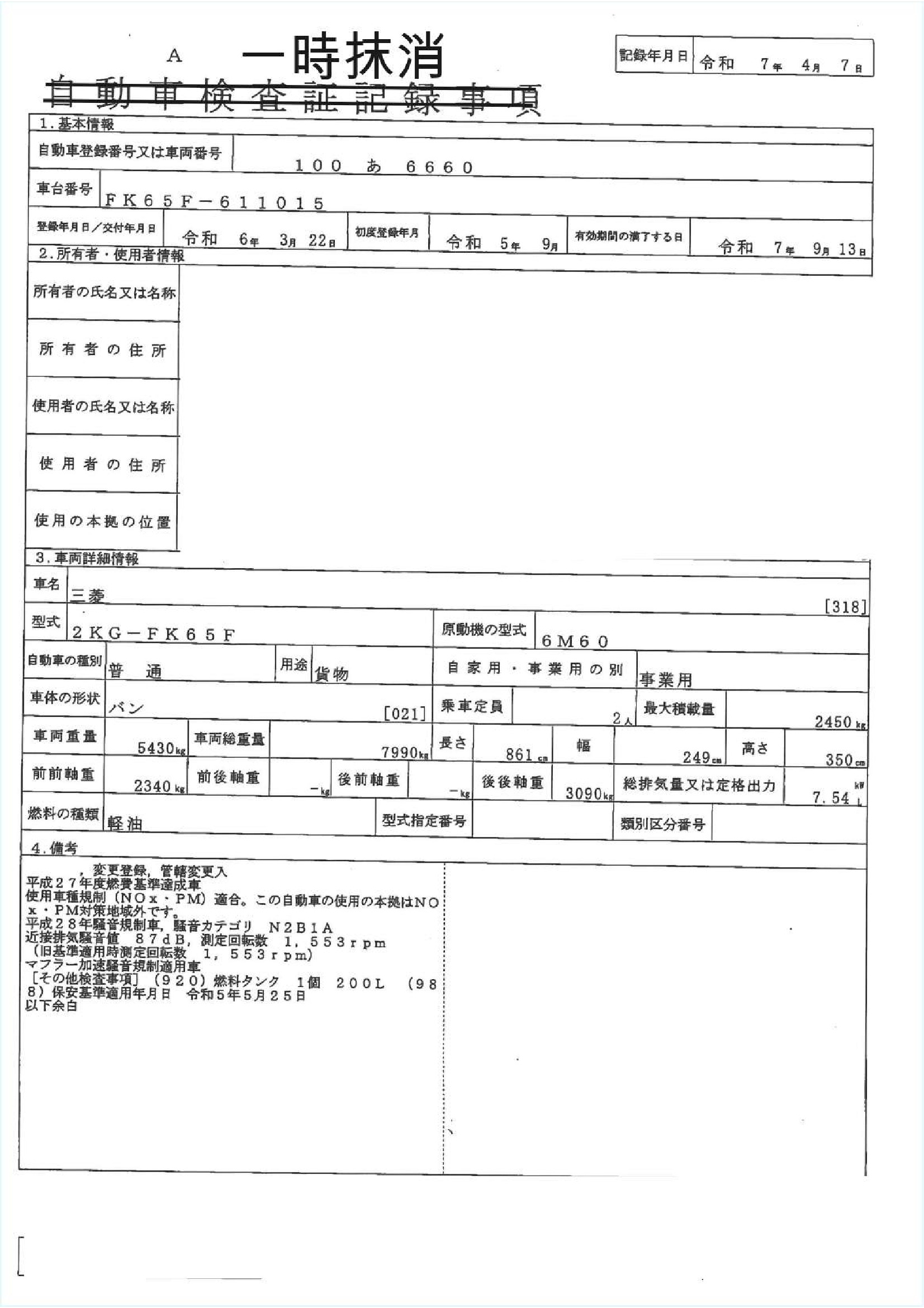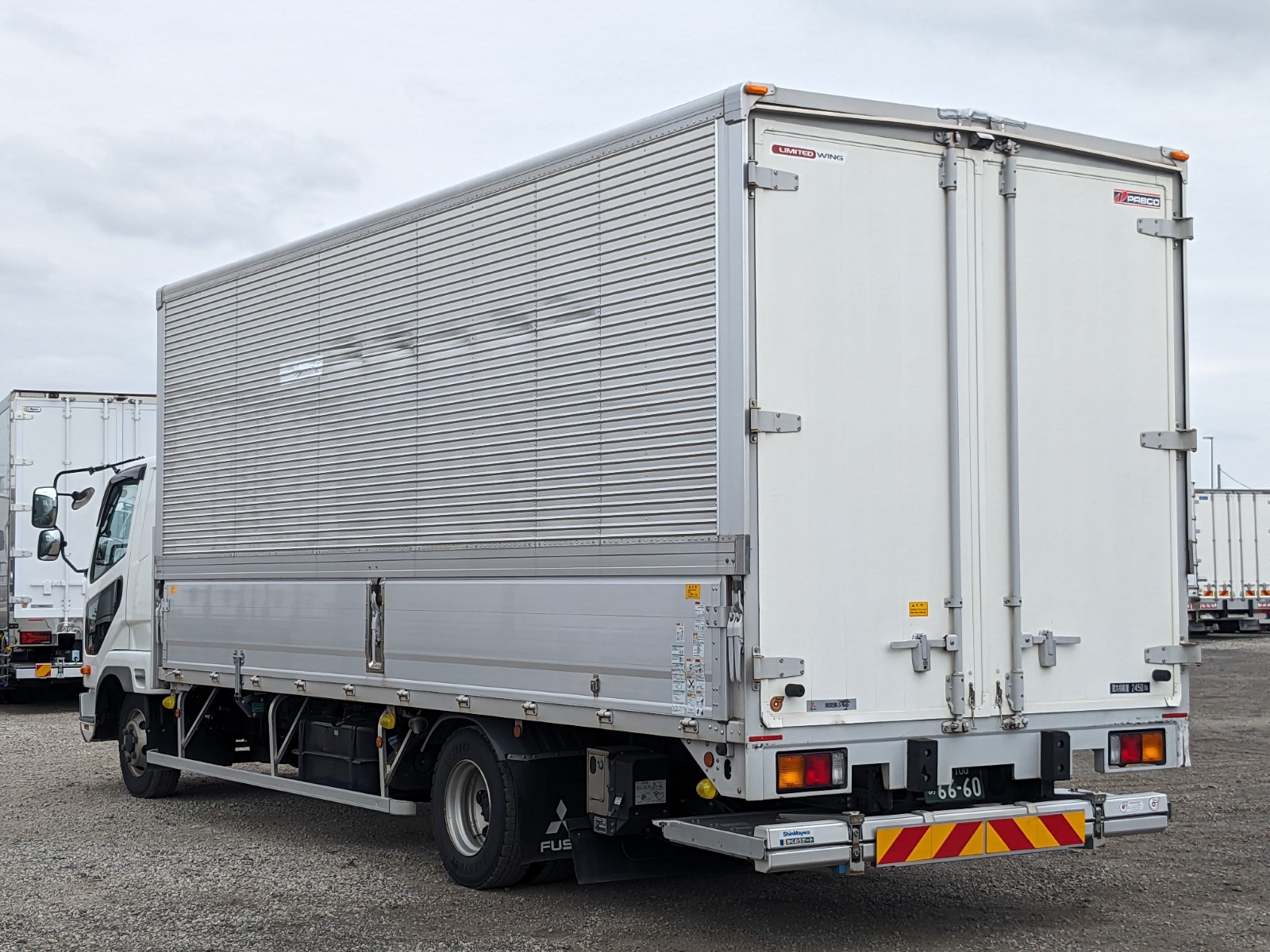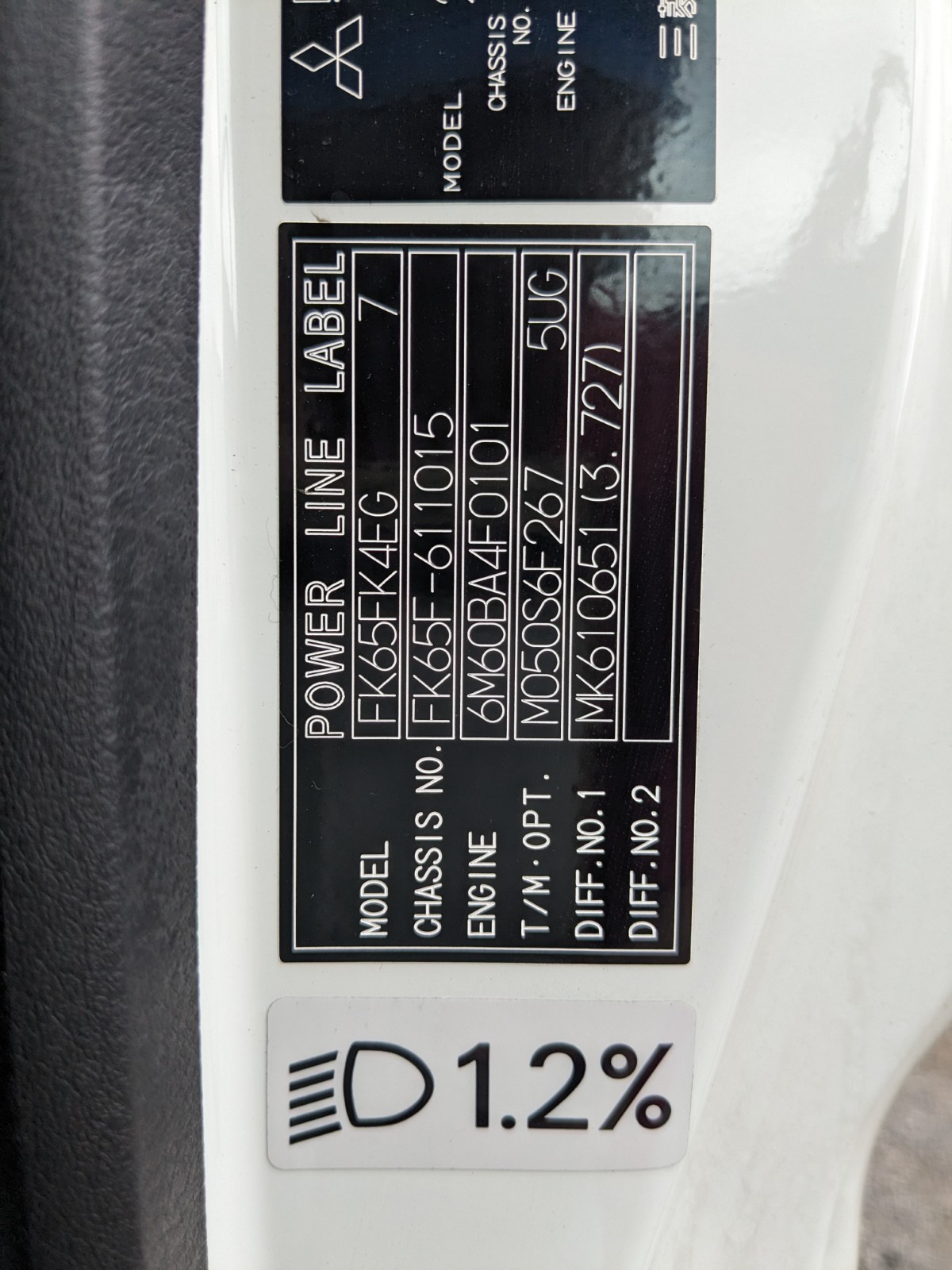 【型式】2KG-FK65F【メーカー】三菱ふそう【初年度登録】令和 5年 9月【形状】アルミウィング【積載量(kg)】2,450kg【走行距離】85,020km【車検期限】一時抹消【荷台内寸】長:6,240mm 幅:2,400mm 高:2,400mm【ミッション】マニュアル 6速【馬力】220PS/162KW【タイヤサイズ】F:225/80R17.5 R:225/80R17.5【リサイクル料】10,910円【車台番号】FK65F-611015-A【ボディ内寸】長:6,240mm 幅:2,400mm 高:2,400mm 門高:2,280mm◎ 良好 ○ 通常走行問題なし △ 要修理 / 装備なし ◆チェックシート【エンジン】異音 結果:◎オイル混入 結果:◎オイル漏れ 結果:◎水混入 結果:◎水漏れ 結果:◎燃料漏れ 結果:◎排気 結果:◎マフラー 結果:〇 状態:カバー曲り 写真:https://www.ushitruck.com/storage/vehicle/check/10604/engine_muffler_file_vehicle_check_image_20251002190520WiORN.JPGターボ 結果:◎冷却水吹返 結果:◎【ミッション】ギア鳴き 結果:◎ギア抜け 結果:◎クラッチ 結果:◎異音 結果:◎オイル漏れ 結果:◎リターダ 結果:/【電装関係】エアコン 結果:◎スターター 結果:◎オルタネーター 結果:◎P/W(運転席) 結果:◎P/W(助手席) 結果:◎坂道発進装置 結果:◎異常ランプ 結果:◎オーディオ 結果:◎バックカメラ 結果:◎電格ミラー 結果:◎ETC 結果:/タコグラフ 結果:◎ 状態:アナログ【上物仕様】床材質 結果:/ 状態:木材【キャビン】シート 結果:〇 状態:擦れ 、 汚れヘッドライト 結果:◎ 状態:HIDウィンカー 結果:◎ワイパー 結果:◎ミラー 結果:◎【走行関係】リーフサス 結果:◎エアサス 結果:◎ 状態:リヤエアサス 写真:https://www.ushitruck.com/storage/vehicle/check/10604/drive_airsus_file_vehicle_check_image_20251002191753b2ueE.JPGパワステ 結果:◎ハンドル 結果:◎燃料タンク 結果:◎ 状態:スチール 200L【デフ】異音 結果:◎オイル漏れ 結果:◎デフロック 結果:/◆特記事項キャブ内キズ・汚れ。フロント左コーナーパネル・ライトベゼル割れ。左ドアパネル凹み。エンジンキー1本(スペアー無)。◆記録簿有(R6/4、R6/9)◆上物仕様上物名:アルミウイング メーカー:パブコ 型式「製造番号」:「22-9C5314」 年式:令和 4年 【備考】引出しフック5対。ラッシングレール2段。庫内灯3。左ウイングコルゲートパネル凹み穴あき補修有。床板削れ。上物名:パワーゲート/格納ゲート メーカー:新明和工業 型式「製造番号」:RAK10-6495D「S2204003735」 【備考】PG寸法:全長1550mm・全幅2180mm・有効長1290mm・有効幅2115mm。最大荷重1000㎏。ラジコン付。 床歩み板付き。◆外装状態キャブコーション:有フレーム番号:確認済フレームのさび:無飛石:点傷有